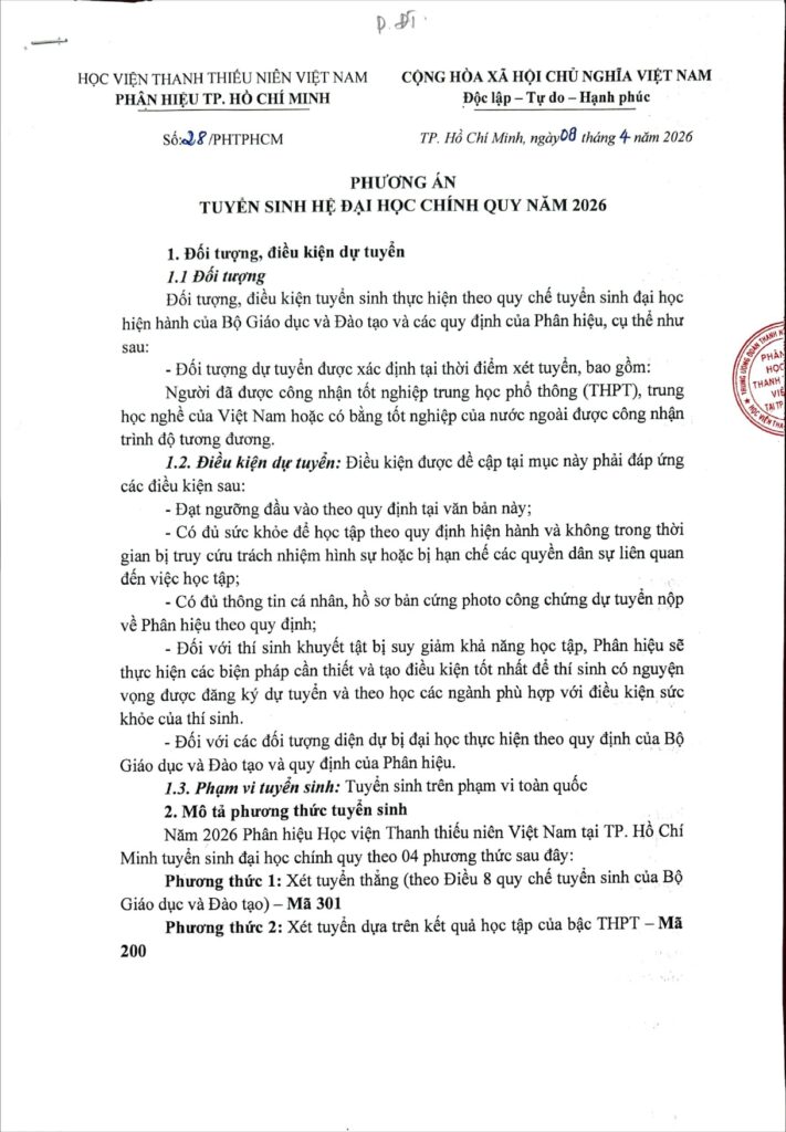 Tin Mới Nhất, TIN TỨC, TUYỂN SINH ĐẠI HỌC, Tuyển Sinh Đại Học Chính Quy PHƯƠNG ÁN TUYỂN SINH ĐẠI HỌC NĂM 2026 – PHÂN HIỆU HỌC VIỆN THANH THIẾU NIÊN VIỆT NAM TẠI TP. HỒ CHÍ MINH Posted on 08/04/202610/04/2026 by admin admin admin admin TUYỂN SINH HỆ ĐẠI HỌC CHÍNH QUY NĂM 2026 – PHÂN HIỆU HỌC VIỆN THANH THIẾU NIÊN VIỆT NAM TẠI TP. HỒ CHÍ MINH THÔNG TIN TUYỂN SINH NĂM 2026 – PHÂN HIỆU HỌC VIỆN THANH THIẾU NIÊN VIỆT NAM TẠI TP. HỒ CHÍ MINH